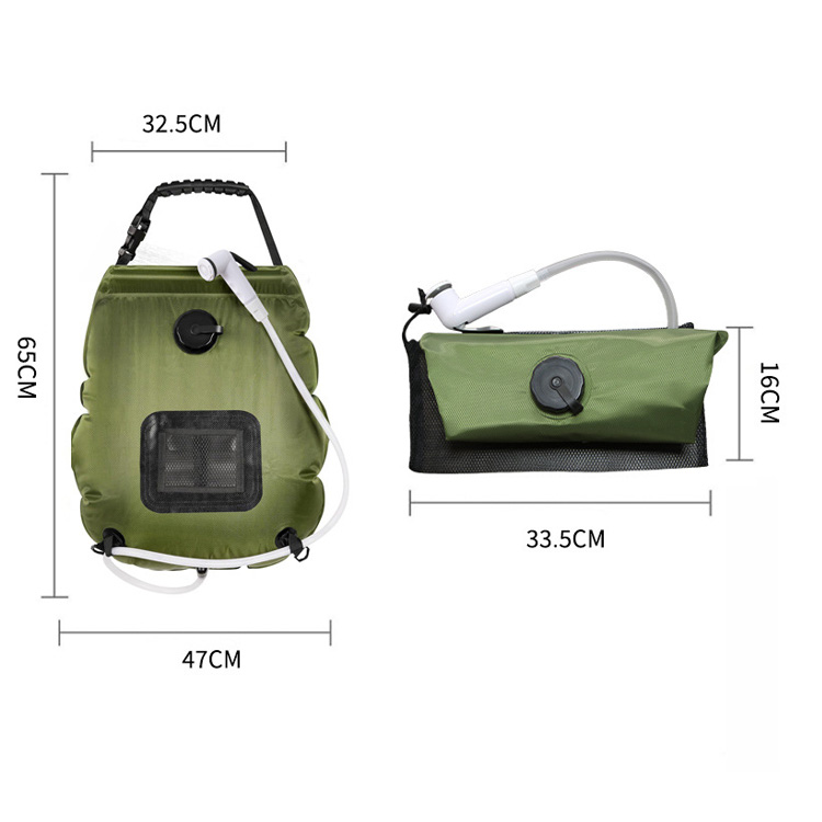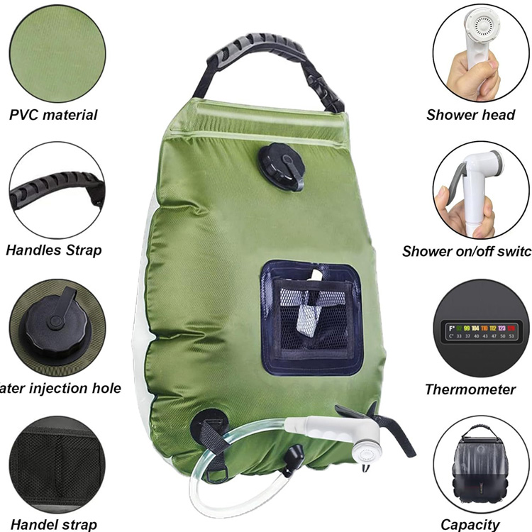 Vòi hoa sen di động năng lượng mặt trời Cắm trại sưởi ấm Túi tắm cắm trại. Giải pháp vệ sinh di động tối ưu của bạn cho những cuộc phiêu lưu ngoài trời. Túi tắm năng lượng mặt trời này cung cấp 5 gallon/20L nước nóng để cắm trại thoải mái. Khai thác năng lượng mặt trời, đảm bảo trải nghiệm tắm nước ấm, sảng khoái ở mọi nơi trong vùng hoang dã.
