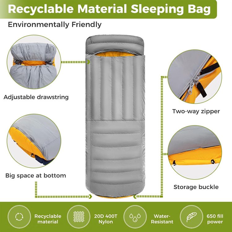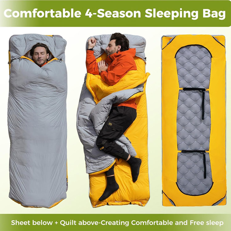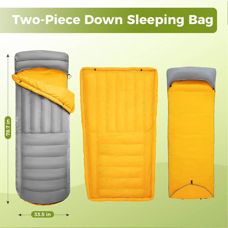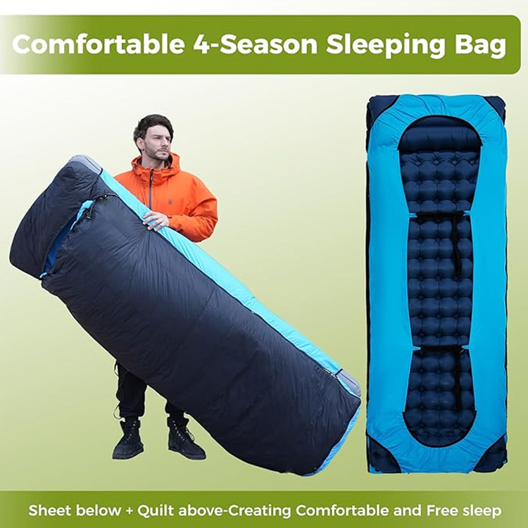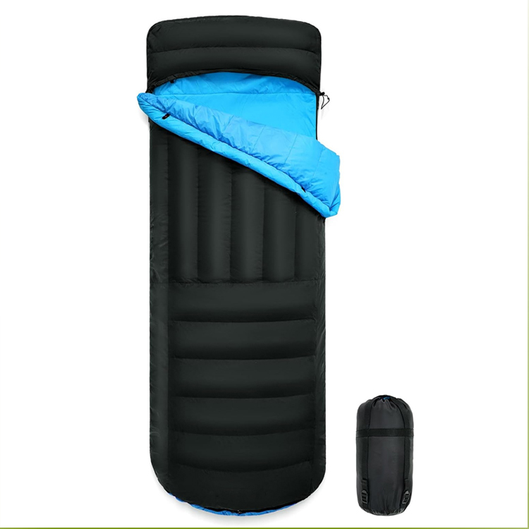 Chăn cắm trại siêu nhẹ Tấm đệm ngủ vịt xuống. Hệ thống giấc ngủ bốn mùa tối ưu của bạn cho những cuộc phiêu lưu nơi hoang dã. Túi ngủ siêu nhẹ này kết hợp lớp cách nhiệt hình vịt cao cấp với một tấm đệm bơm hơi tích hợp. Có chức năng vừa là chăn bông vừa là túi ngủ, nó mang lại sự ấm áp tối đa mà không ảnh hưởng đến trọng lượng.